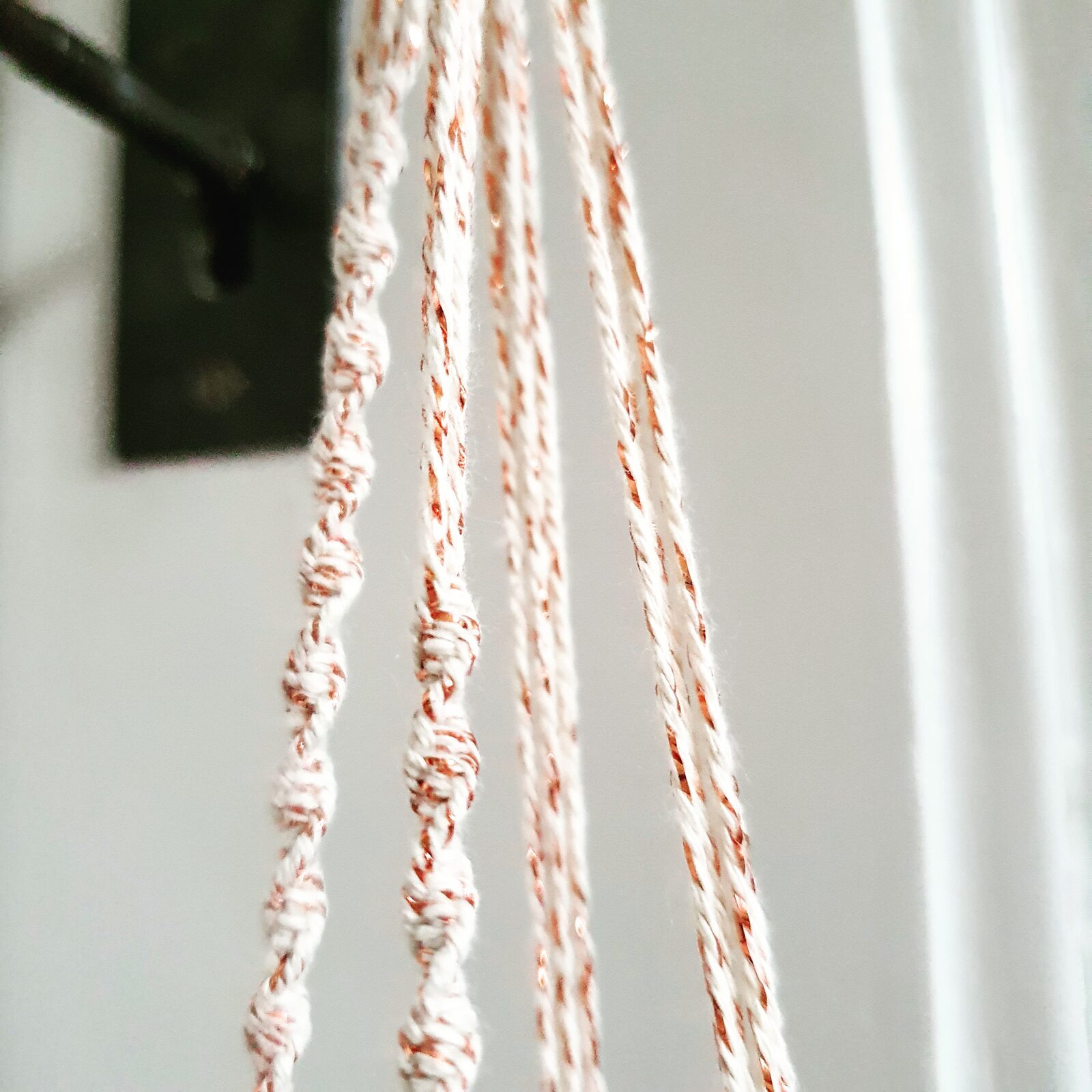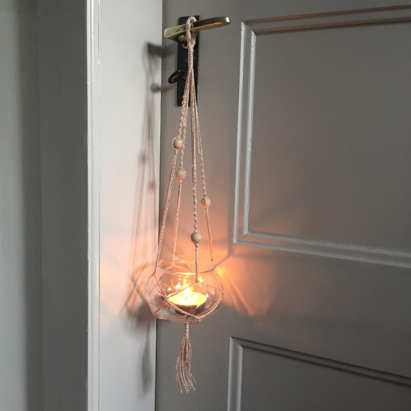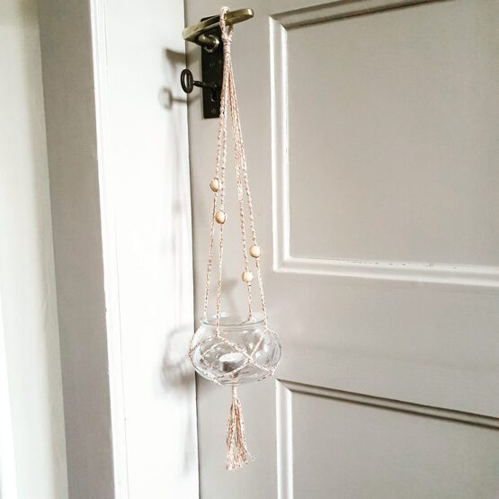 Material: Baumwollgarn mit Glitzerfaden, Holz, Glasbehälter