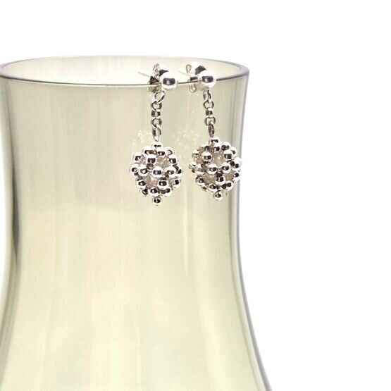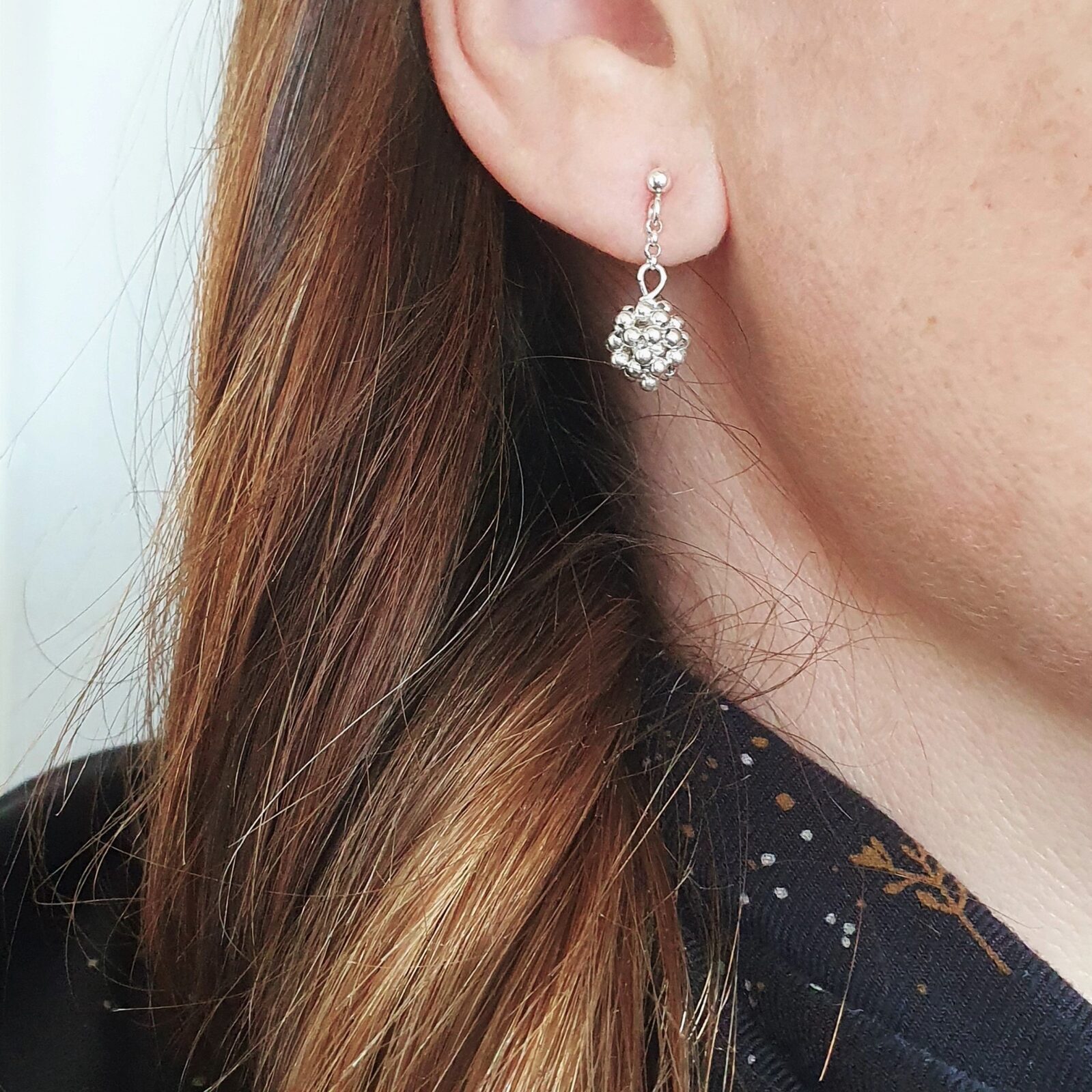 Eine durchwegs runde Sache sind diese kleinen Ohrstecker. Sie sind aus kleinsten Silber Perlen von Hand zur runden Perle geflechtet.